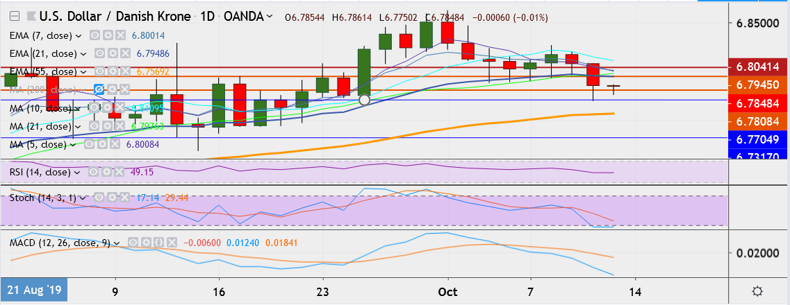 - USD/DKK is currently trading 0.05 percent down at 6.7824, having hit low of 6.7688 the day before, its lowest since September 20.