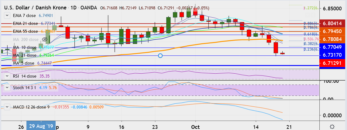 - USD/DKK is currently trading 0.1 percent down at 6.7115, having hit low of 6.7063 on Thursday, its lowest since August 26.
