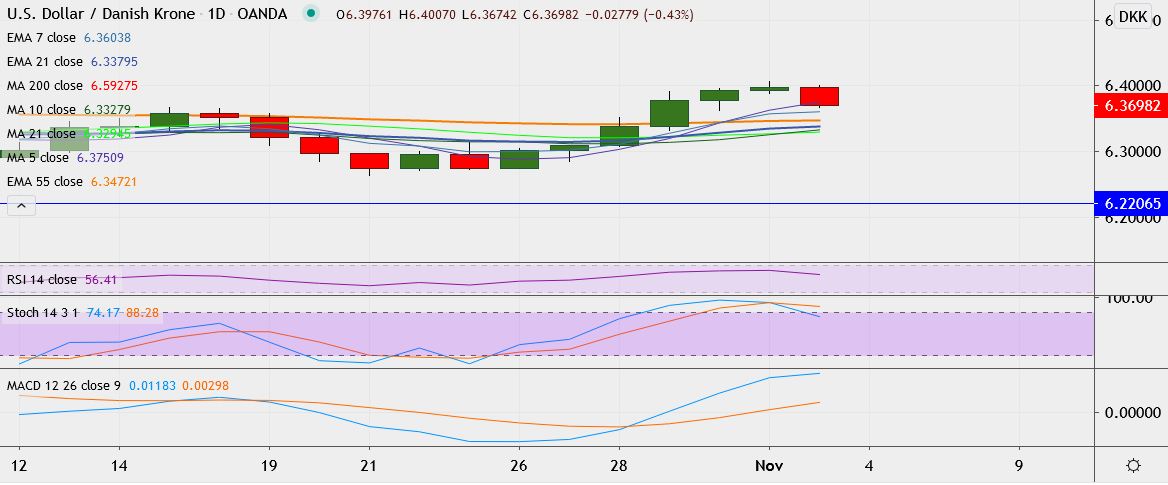 - USD/DKK is trading 0.4 percent lower at 6.3691, having hit high of 6.4066 on Monday, its highest since September 28.
