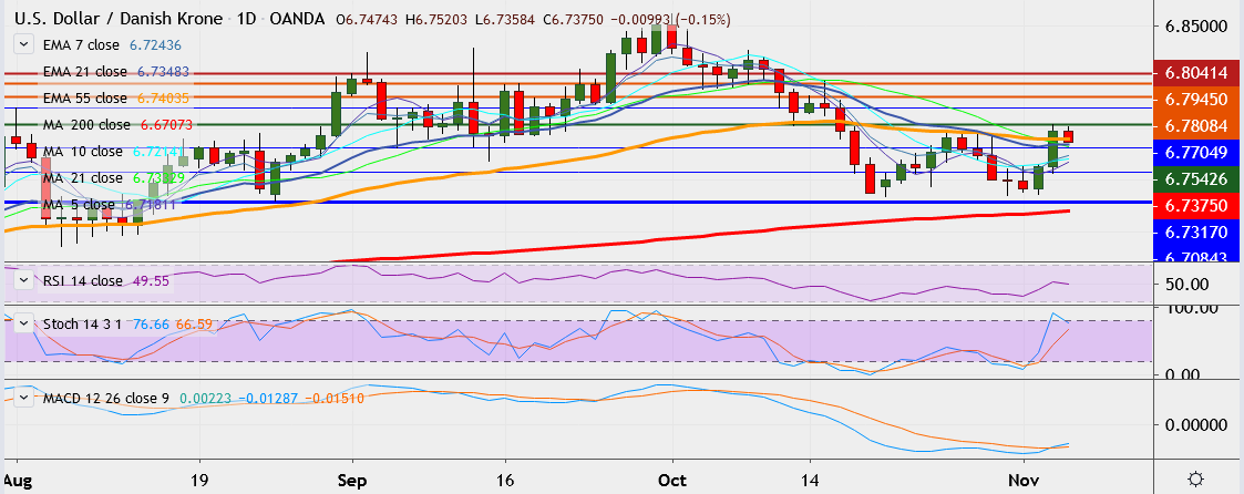- USD/DKK is currently trading 0.1 percent down at 6.7376, having hit high of 6.7541 on Tuesday, its highest since October 16.