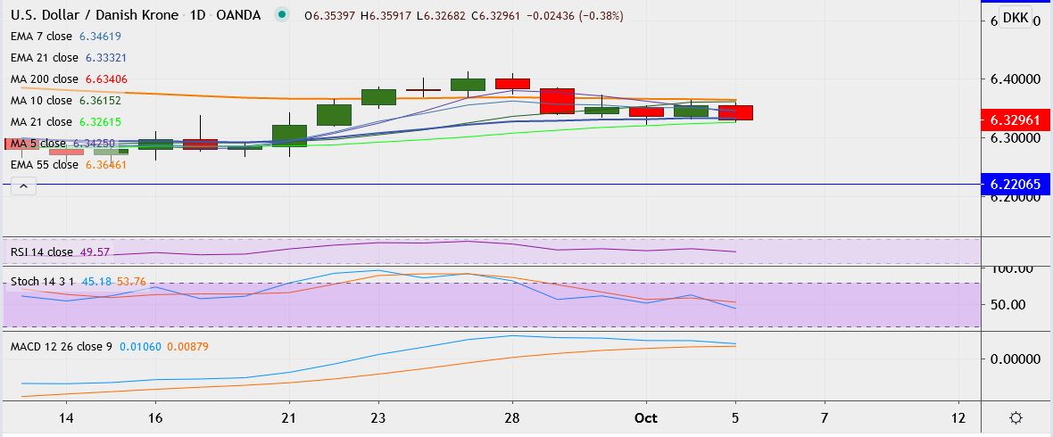 - USD/DKK is trading 0.4 percent lower at 6.3314, having hit low of 6.3228 on Thursday, its lowest since September 22.