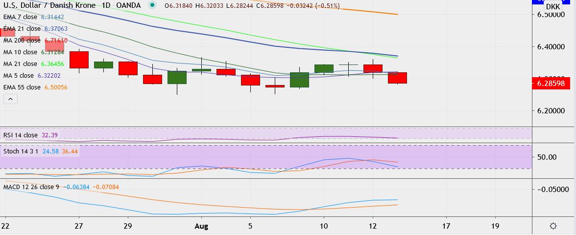 - USD/DKK is trading 0.5 percent lower at 6.2861, having hit high of 6.3596 on Wednesday, its highest since August 3.