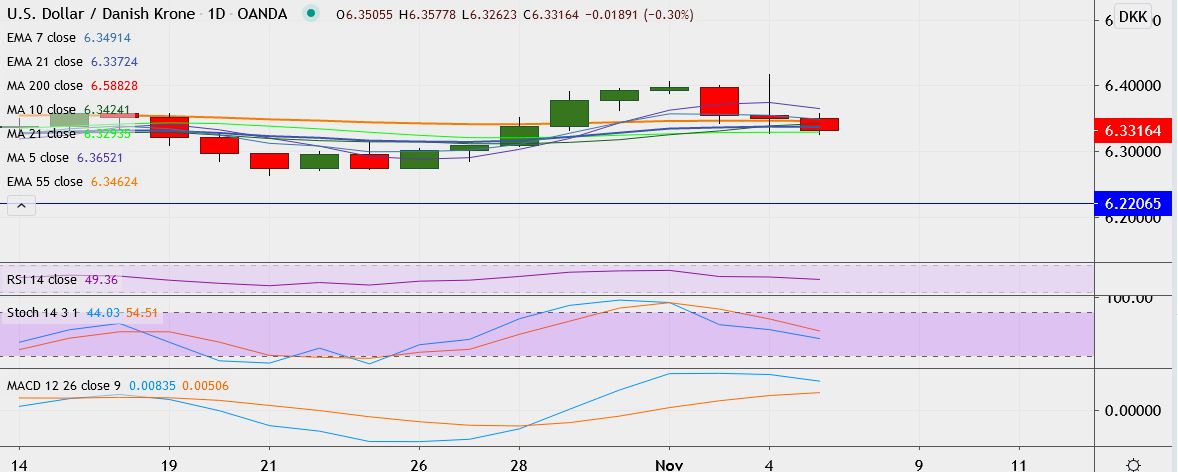 - USD/DKK is trading 0.3 percent lower at 6.3322, having hit high of 6.4178 on Wednesday, its highest since July 24.