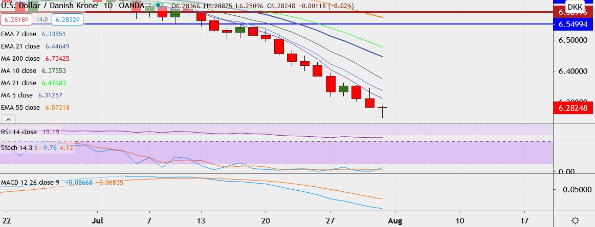 - USD/DKK is trading 0.1 down at 6.2790, having hit low of 6.2509 earlier, its lowest since May 2018.