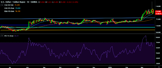 - It made intraday high at 74.61 and low at 74.02 marks.