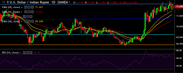 We prefer to take long position on USD/INR only above 71.97, stop loss 71.70 and target of 72.68.
