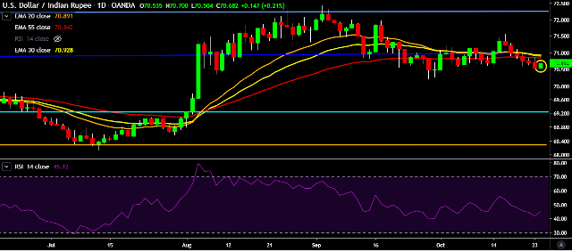 We prefer to take short position on USD/INR only below 70.50, stop loss 71.02 and target of 70.10.