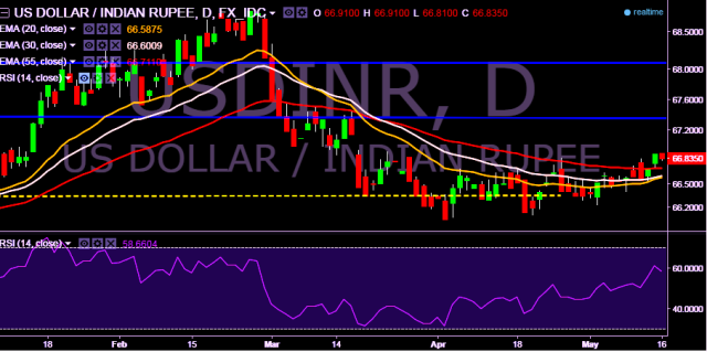 We prefer to take short position in USD/INR below 66.80, stop loss 66.95 and target 66.42 marks.