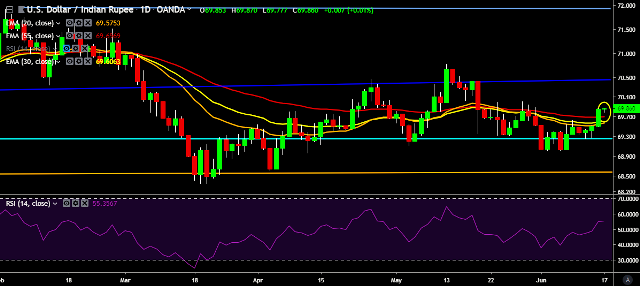 - USD/INR is currently trading around 69.86 marks.