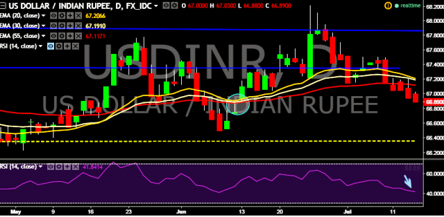 We prefer to take short position in USD/INR below 66.87, stop loss at 67.22 and target of 66.64/ 66.42 marks.