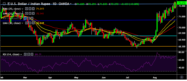 We prefer to take long position on USD/INR around 72.25, stop loss 71.90 and target of 72.89.