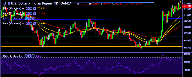 - USD/INR is currently trading around 71.75 marks.