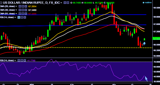 We prefer to take long position in USD/INR around 66.75, stop loss 66.35 and target 67.18/ 67.37 levels.
