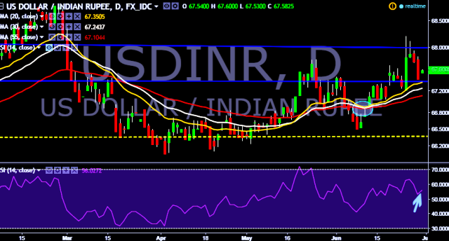 We prefer to take long position in USD/INR around 67.55, stop loss at 67.42 and target of 67.84/ 68.12 marks.