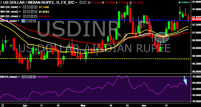 - Key resistances are seen at 67.45, 67.52, 67.81, 68.05 (crossover of 20D, 30D and 55D EMA) and 68.35 (March 1, 2016 high) respectively.