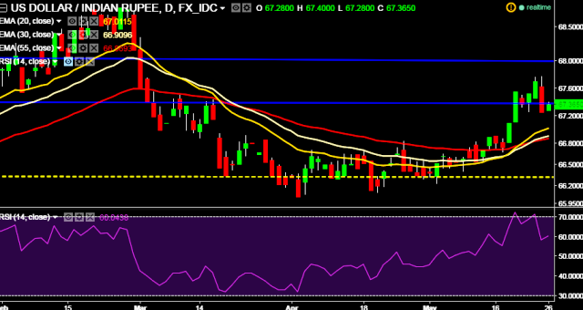 We prefer to take long position in USD/INR only above 67.36, stop loss 67.26 and target 67.81/ 68.05 levels.