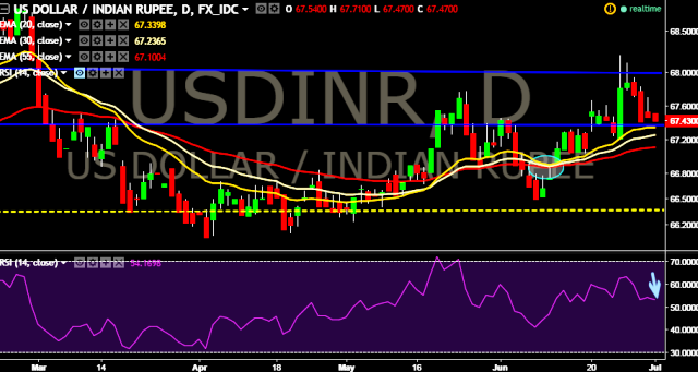 We prefer to take short position in USD/INR only below 67.42, stop loss at 67.71 and target of 67.17/ 66.91 marks.