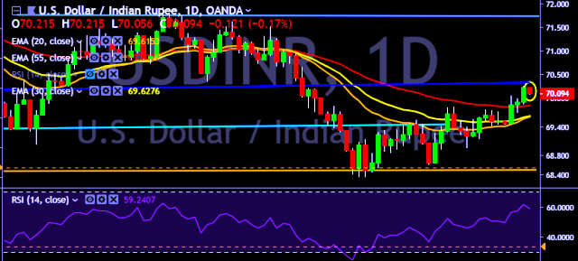 We prefer to take long position on USD/INR around 70.10, stop loss 69.85 and target of 70.51/70.68.