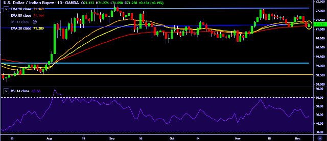 - USD/INR is currently trading around 71.24 marks.