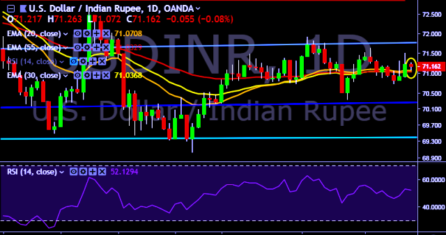 We prefer to take long position on USD/INR around 71.15, stop loss at 71.02 and target of 71.50.