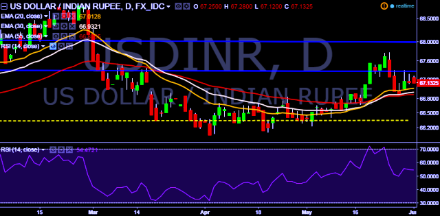 - Key resistances are seen at 67.81, 68.05 (crossover of 20D, 30D and 55D EMA) and 68.35 (March 1, 2016 high) respectively.