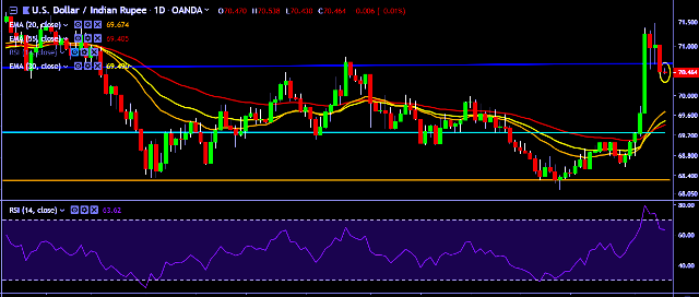 We prefer to take long position on USD/INR around 70.40, stop loss 70.20 and target of 70.76/71.26/71.78.