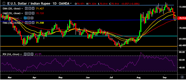 We prefer to take short position on USD/INR around 70.90, stop loss 71.10 and target of 70.47.