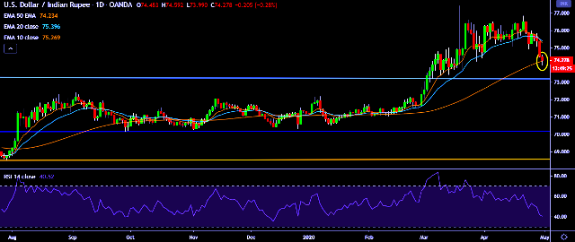 - USD/INR is currently trading around 74.26 marks.