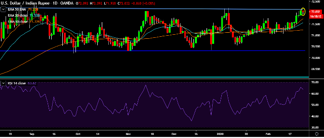 We prefer to take long position on USD/INR only above 72.10, stop loss at 71.70 and target of 72.42/72.68.