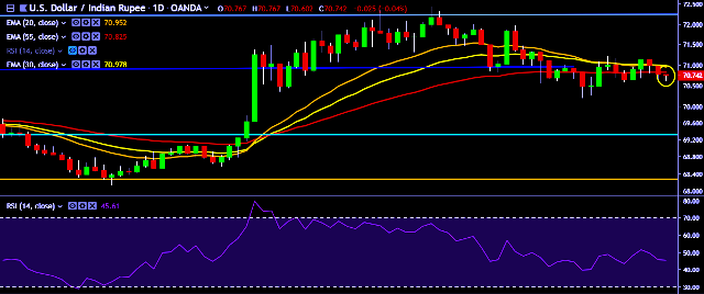 - USD/INR is currently trading around 70.80 marks.