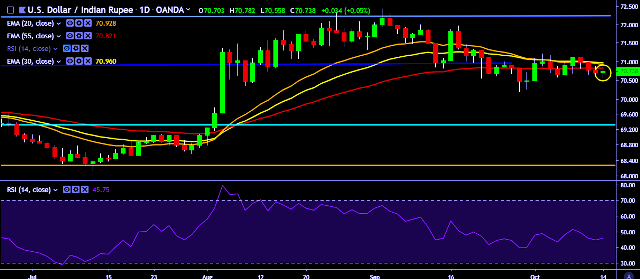 We prefer to take long position on USD/INR only above 70.90, stop loss 70.47 and target of 71.46/71.80.