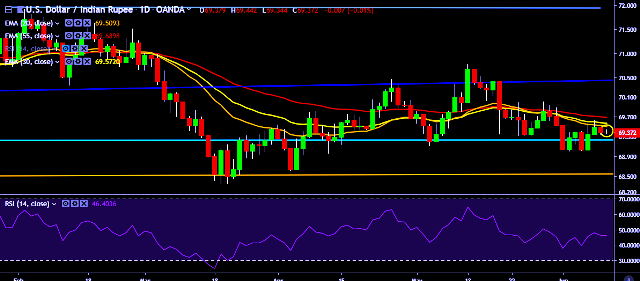 We prefer to take short position on USD/INR only below 69.34, stop loss 69.52 and target of 69.02.