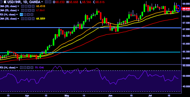 We prefer to take long position on USD/INR only above 68.80, stop loss at 68.50 and target of 69.52.