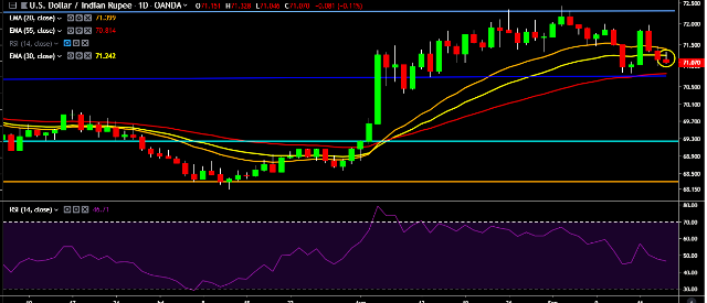 We prefer to take short position on USD/INR only below 70.90, stop loss 71.32 and target of 70.47.