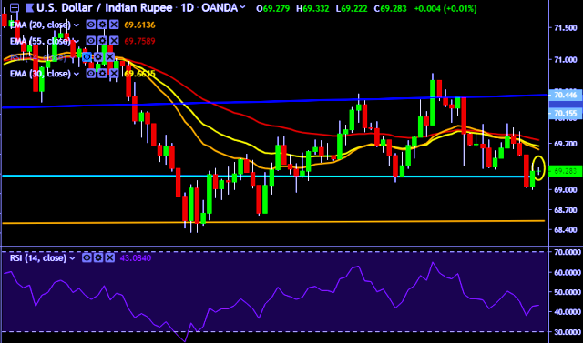 - USD/INR is currently trading around 69.32 marks.