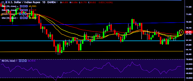 We prefer to take long position on USD/INR only above 69.85, stop loss 69.70 and target of 70.20/70.52.
