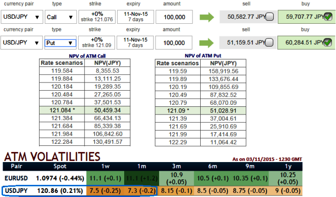 NPV of 1w ATM put is 51028.91 while premiums trading above 18.13% at JPY 60284.51 for lot size 100,000 units.