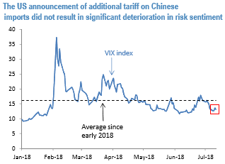 This week’s USDJPY rally despite the US-China trade war deterioration was somewhat puzzling to us, but it likely reflects market optimism about the situation. It is consistent with that the US announcement of additional tariffs on $200bn worth of Chinese imports did not trigger the VIX spike (refer above chart). Whether the markets can keep up with the optimism would be important for JPY in near future.
