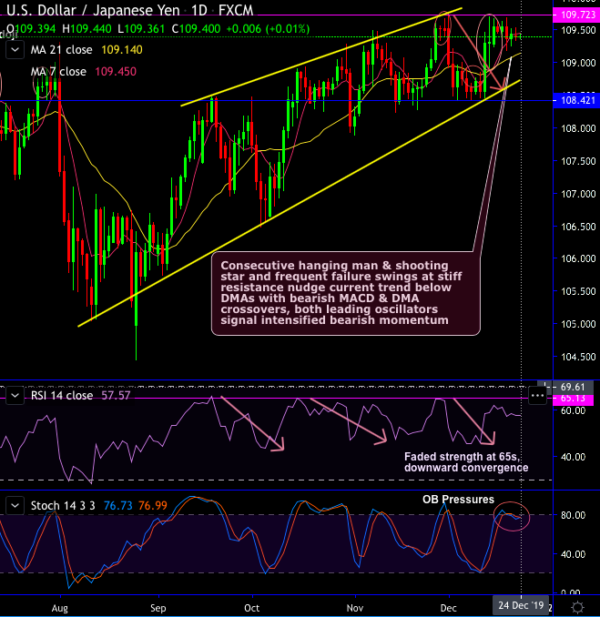 USDJPY forms back-to-back hanging man, long-legged doji and shooting star candles at the stiff resistance of 109.723 levels, the bearish patterns nudge the current trend towards DMAs with overbought sentiments as both leading oscillators signal the intensified weakness. The bearish streaks from the highs of 109.727 levels seem to have halted at 108.427 levels (refer daily chart).