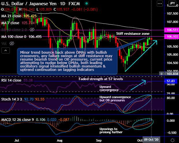 As the minor trend bounces back above DMAs with bullish crossovers, bulls are still on the cards. However, any failure swings at stiff resistance zone of 106.103 – 106.511 levels, may resume bearish trend upon overbought pressures (refer daily chart).