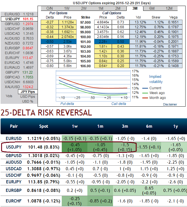 Yen IVs: Live September meeting should keep 2M vol supported; while yen 1-3m risk-reversals still a better sale as Fed considers global slowdown risks and Bexit settlement which is why the US central bank keeps deferring rate hikes at least until the end of 2016 or by Q1 of 2017.
