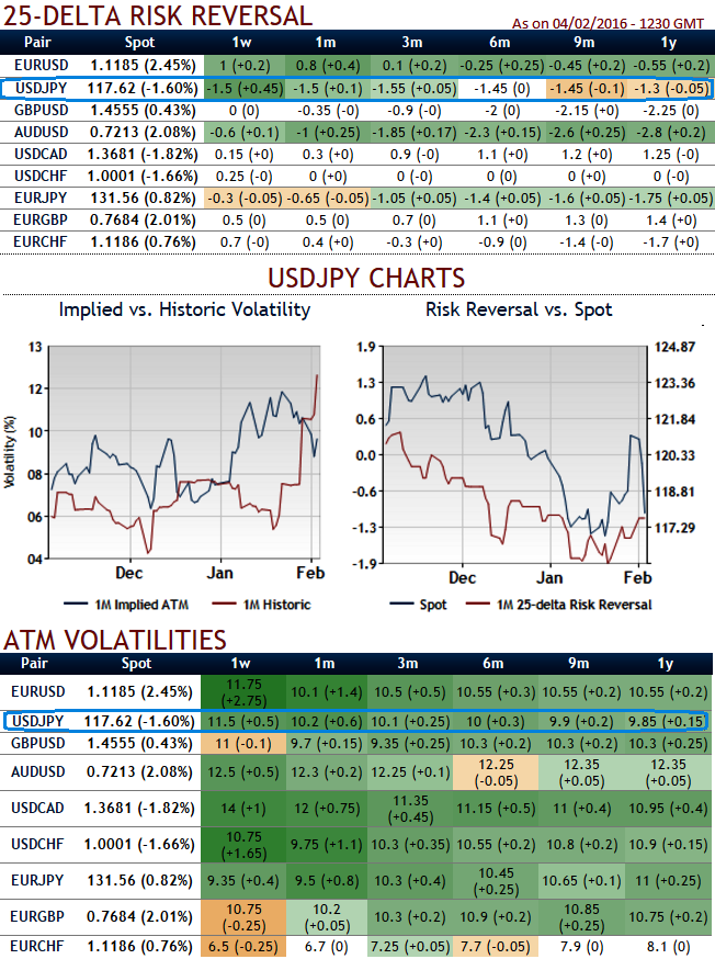The current spot FX is trading at 116.812, we expect dips extending up to 116.084 and even at 115 levels in near terms. So, it is understood that bearish momentum is bolstering as we saw that from delta risk reversal table and technical indications in the previous post. Hence, aggressive bears can initiate strategy using ATM puts.