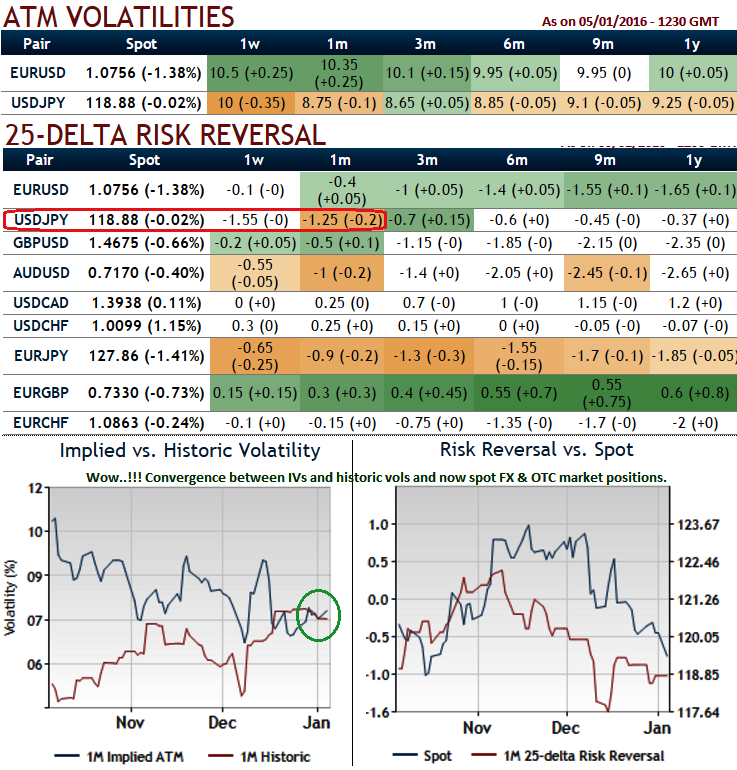 Also observe how the historic vols & IVs and spot FX market positions and OTC sentiments are converging, this would mean that these computations are likely to direct the underlying market southwards for next 1 month.