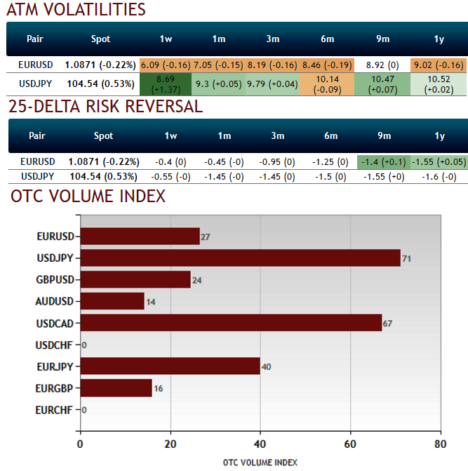 While USDJPY pin risk is seen in options expiring on this Friday at strikes 103.75, most importantly, as you could make out from the OTC VIX USDJPY is the pair to have highest volumes. By this we mean FX Options strikes in large notional amounts, when close to the current spot level, can have a magnetic effect on spot prices. That is, the spot may trend around those strikes as the holders of the options will aggressively hedge the underlying delta.