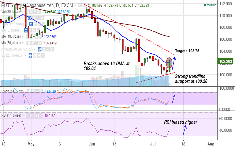 - Support on the downside seen at 102.04 (10-DMA), 101.33 (5-DMA) and then 100.20 (trendline).