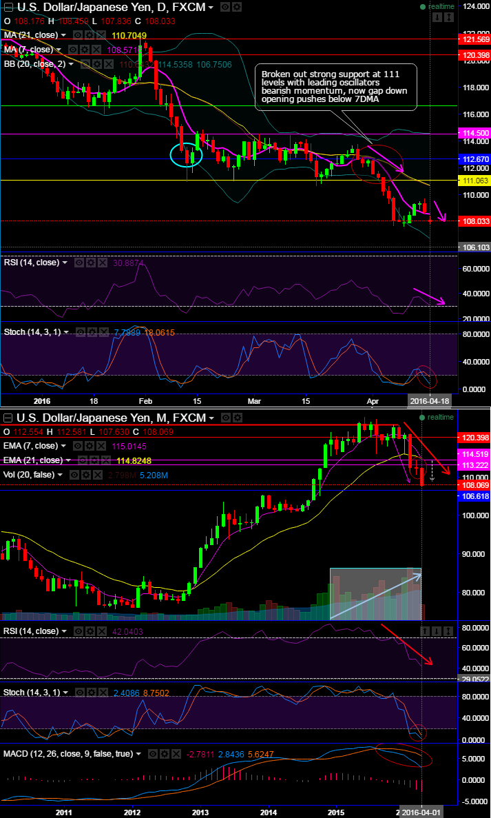 After a stern break-out below major supports at 111 levels (lower BB, Avrg. of recent lows), our bearish targets of 109.698 or 108.029 levels are very well achieved, now signals even more scope for downside to targets upto106.618 levels.