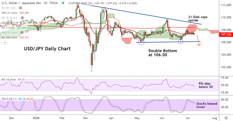 USD/JPY is trading in a narrow range amid the cautious market mood with session highs at 107.36 and lows at 107.18.