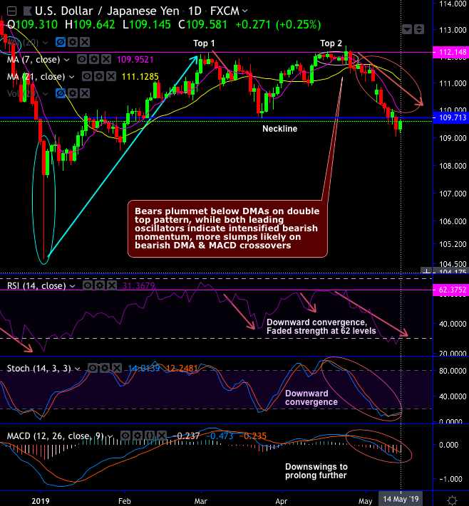 - Bears managed to breach below the double top neckline at 109.713 level, while both leading oscillators indicate intensified bearish momentum, more slumps likely on bearish DMA & MACD crossovers (refer daily plotting).