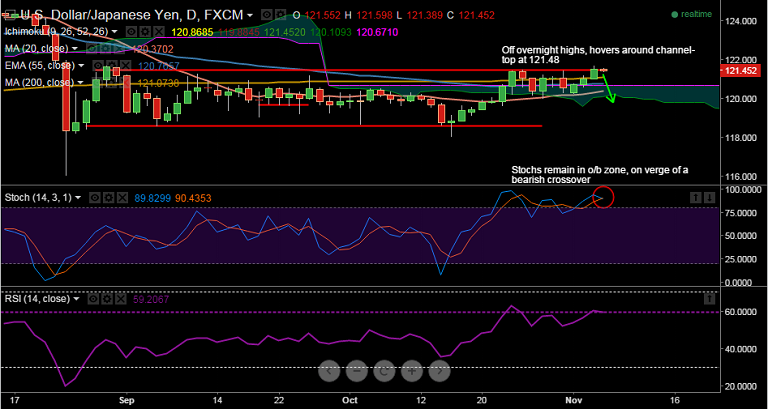 - The pair is currently trading at 121.45, just below channel top at 121.48, with supports on the downside at 121.10 (200-DMA) and then 121