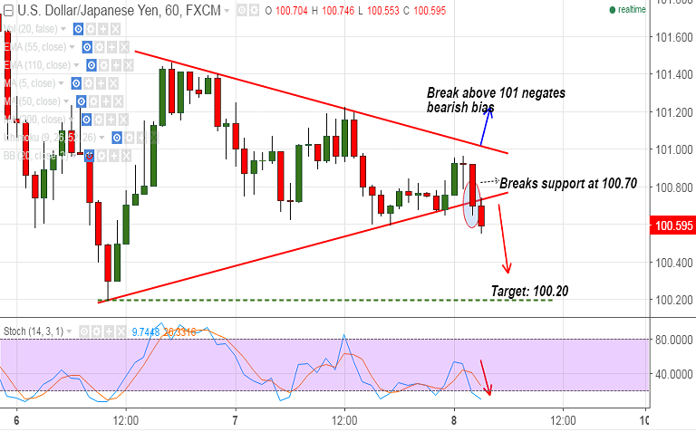 - Pair breaks trendline support at 100.70 on hourly charts. Test of 100.20 likely.